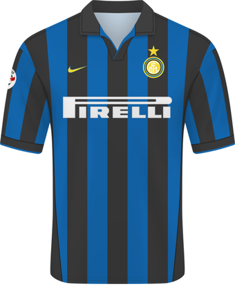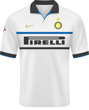 Black and blue striped home shirt and a white away one with similar tints. That was the jersey of Internazionale (or Inter Milan) made by Nike for the 1998-99 season.
